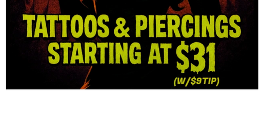 That's right! We've got tons of spooky designs and basic piercings starting at $31 this HALLOWEEN! GOODIE BAGS & REFRESHMENTS!